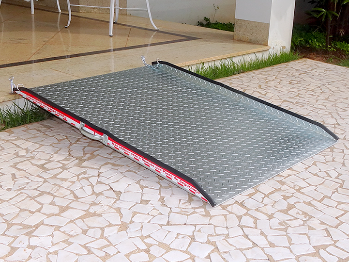 Rampa de Aço destinado para acessibilidade de cadeirantes e pessoas com baixa mobilidades no tamanho de 0,60 metro de comprimento x 0,90 metro de largura.